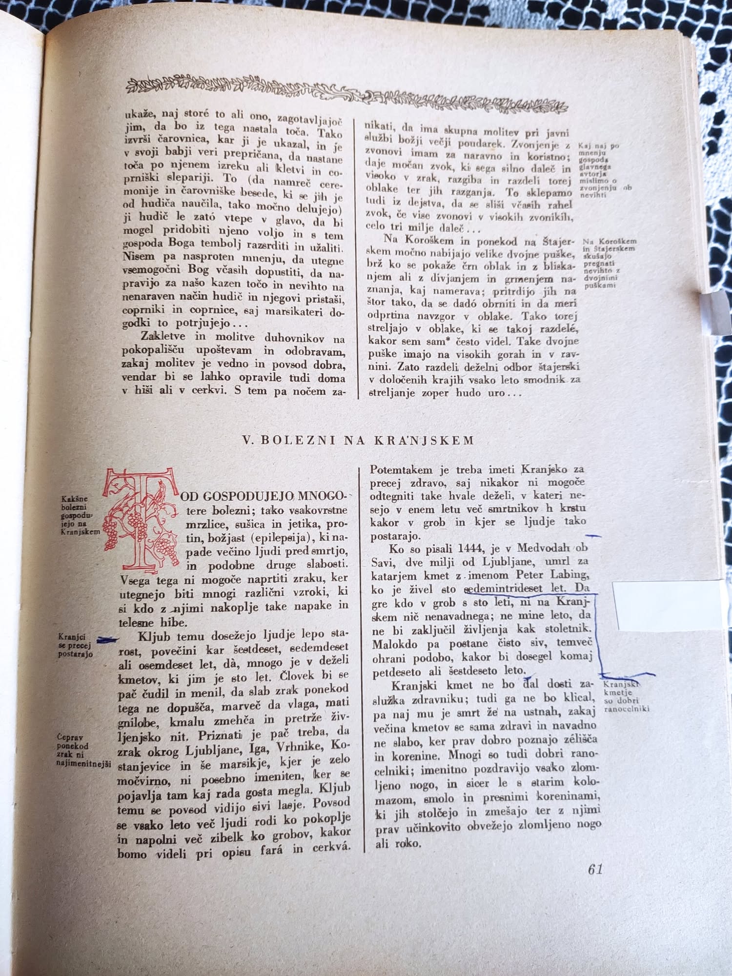 “Ko so pisali 1444, je v Medvodah ob Savi, dve milji od Ljubljane, umrl za katarjem kmet z imenom Peter Labing, ko je živel sto sedemintrideset let. Da gre kdo v grob s sto leti, ni na Kranjskem nič nenavadnega; ne mine leto, da ne bi zaključil življenja kak stoletnik. Malokdo pa postane čisto siv, temveč ohrani podobo, kakor bi dosegel komaj petdeseto ali šestdeseto leto. Kranjski kmet ne bo dal dosti zaslužka zdravniku; tudi ga ne bo klical, pa naj mu je smrt že na ustnah, zakaj večina kmetov se sama zdravi in navadno ne slabo, ker prav dobro poznajo zelišča in korenine. “